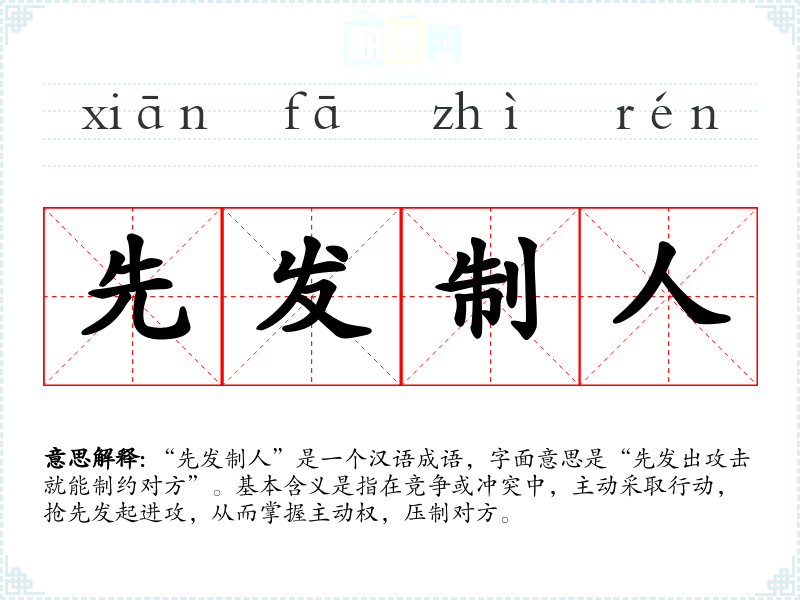 “先发制人”是一个汉语成语,字面意思是“先发出攻击就能制约对方”。基本含义是指在竞争或冲突中,主动采取行动,抢先发起进攻,从而掌握主动权,压制对方。