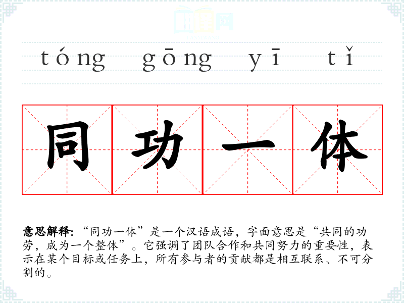 “同功一体”是一个汉语成语,字面意思是“共同的功劳,成为一个整体”。它强调了团队合作和共同努力的重要性,表示在某个目标或任务上,所有参与者的贡献都是相互联系、不可分割的。