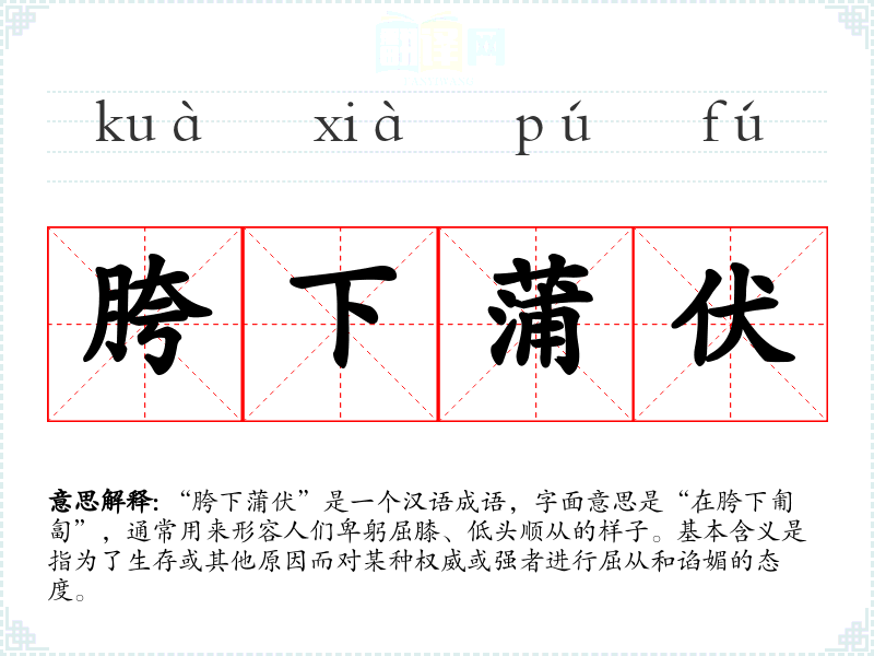 “胯下蒲伏”是一个汉语成语,字面意思是“在胯下匍匐”,通常用来形容人们卑躬屈膝、低头顺从的样子。基本含义是指为了生存或其他原因而对某种权威或强者进行屈从和谄媚的态度。