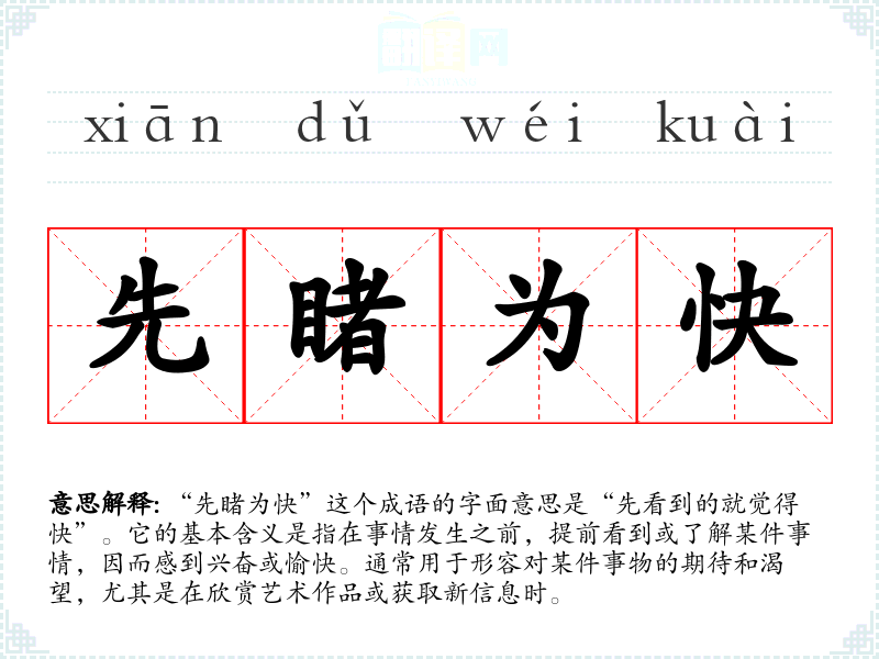 “先睹为快”这个成语的字面意思是“先看到的就觉得快”。它的基本含义是指在事情发生之前,提前看到或了解某件事情,因而感到兴奋或愉快。通常用于形容对某件事物的期待和渴望,尤其是在欣赏艺术作品或获取新信息时。