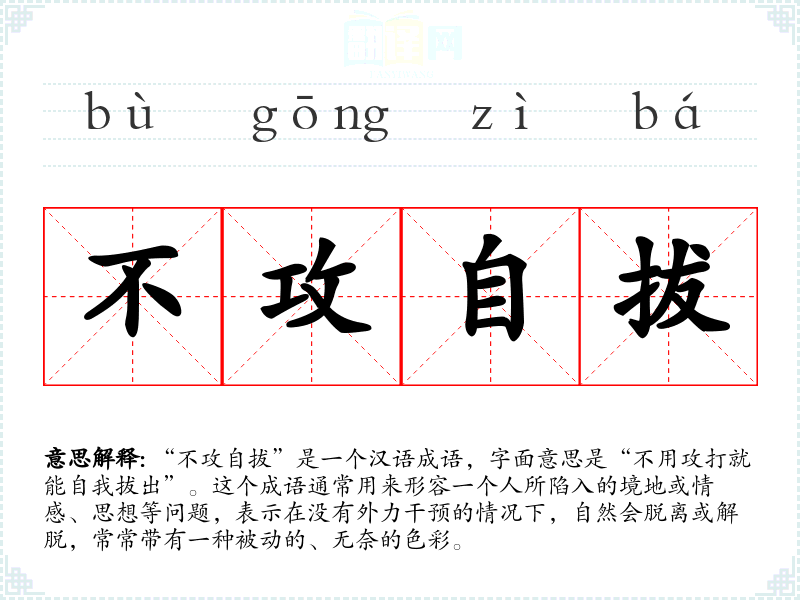 “不攻自拔”是一个汉语成语,字面意思是“不用攻打就能自我拔出”。这个成语通常用来形容一个人所陷入的境地或情感、思想等问题,表示在没有外力干预的情况下,自然会脱离或解脱,常常带有一种被动的、无奈的色彩。