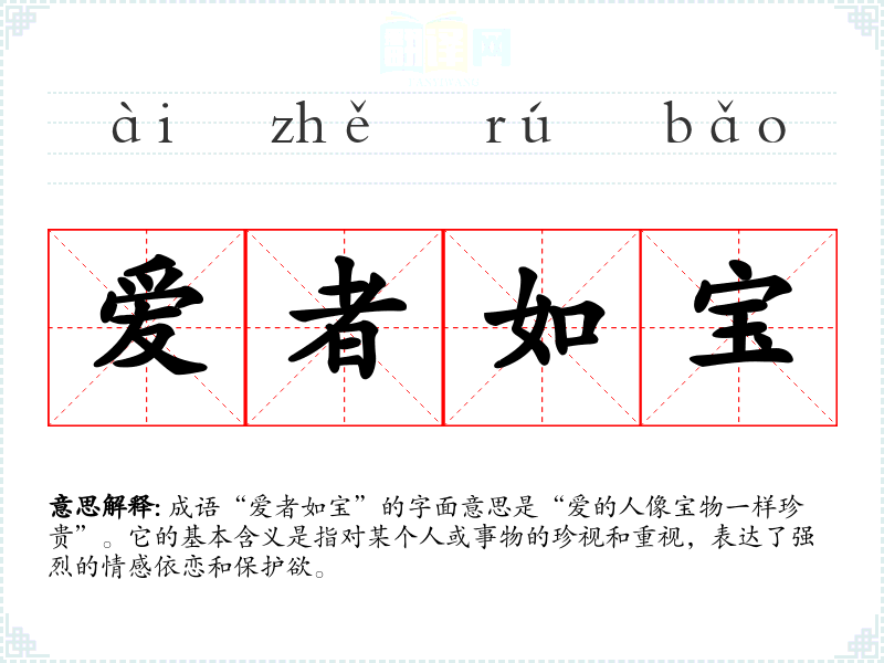 成语“爱者如宝”的字面意思是“爱的人像宝物一样珍贵”。它的基本含义是指对某个人或事物的珍视和重视,表达了强烈的情感依恋和保护欲。