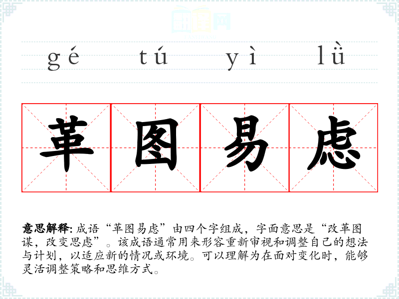 成语“革图易虑”由四个字组成,字面意思是“改革图谋,改变思虑”。该成语通常用来形容重新审视和调整自己的想法与计划,以适应新的情况或环境。可以理解为在面对变化时,能够灵活调整策略和思维方式。