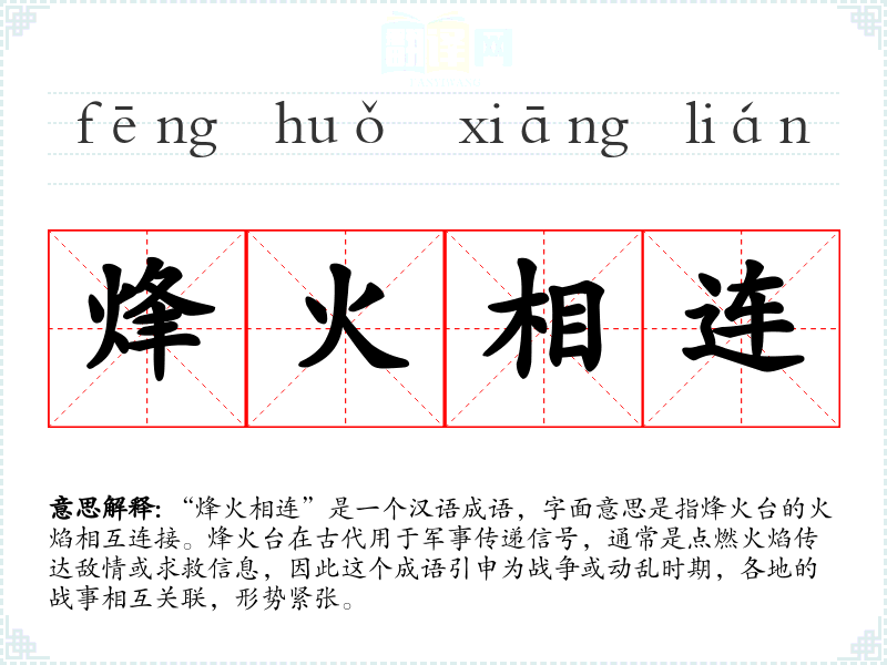 “烽火相连”出自《史记·大秦帝国》,描述了战乱频繁、烽火相接的情景。烽火台是古代传递信息的重要设施,通常设立在山顶或高地,用于警报和联系。因此,这个成语不仅在历史上有其深远的根源,也反映了古代战争的复杂性和紧迫性。
