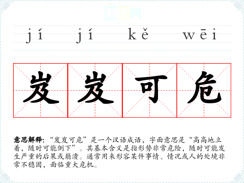 | 岌岌可危 | 岌岌:山高陡峭,就要倒下的样子。形容非常危险,快要倾覆或灭亡。 |