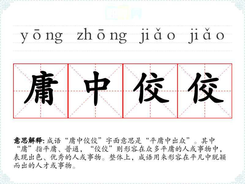 成语“庸中佼佼”字面意思是“平庸中出众”。其中“庸”指平庸、普通,“佼佼”则形容在众多平庸的人或事物中,表现出色、优秀的人或事物。整体上,成语用来形容在平凡中脱颖而出的人才或事物。
