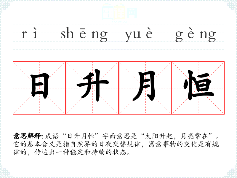 成语“日升月恒”字面意思是“太阳升起,月亮常在”。它的基本含义是指自然界的日夜交替规律,寓意事物的变化是有规律的,传达出一种稳定和持续的状态。