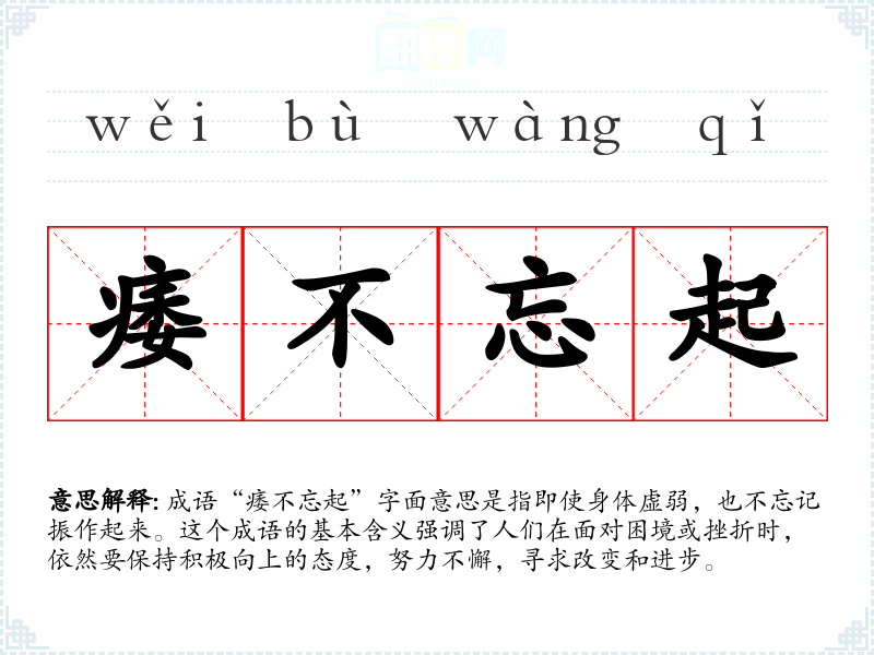成语“痿不忘起”字面意思是指即使身体虚弱,也不忘记振作起来。这个成语的基本含义强调了人们在面对困境或挫折时,依然要保持积极向上的态度,努力不懈,寻求改变和进步。