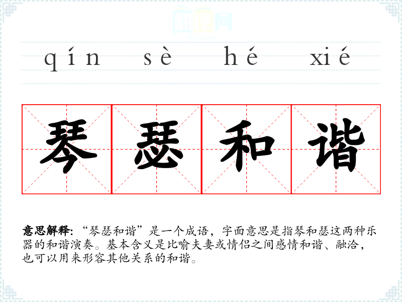 “琴瑟和谐”是一个成语,字面意思是指琴和瑟这两种乐器的和谐演奏。基本含义是比喻夫妻或情侣之间感情和谐、融洽,也可以用来形容其他关系的和谐。