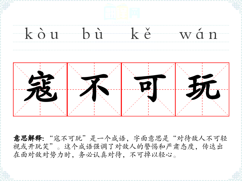 “寇不可玩”是一个成语,字面意思是“对待敌人不可轻视或开玩笑”。这个成语强调了对敌人的警惕和严肃态度,传达出在面对敌对势力时,务必认真对待,不可掉以轻心。