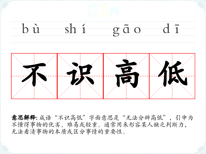 成语“不识高低”字面意思是“无法分辨高低”,引申为不懂得事物的优劣、难易或轻重。通常用来形容某人缺乏判断力,无法看清事物的本质或区分事情的重要性。