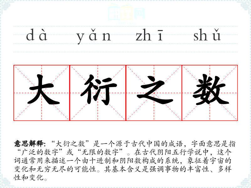 在**传统文化中,数字和象征意义密切相关,“大衍之数”体现了古代人对天地自然、宇宙法则的理解。这一成语在现代社会仍具有一定的适用性,尤其是在讨论复杂性、系统性和多样性时,能够引发人们的思考。