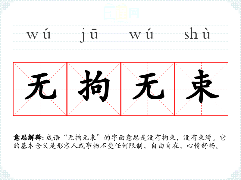 成语“无拘无束”的字面意思是没有拘束,没有束缚。它的基本含义是形容人或事物不受任何限制,自由自在,心情舒畅。