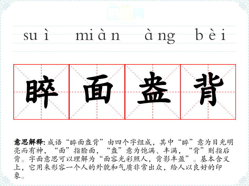 成语“睟面盎背”由四个字组成,其中“睟”意为目光明亮而有神,“面”指脸面,“盎”意为饱满、丰满,“背”则指后背。字面意思可以理解为“面容光彩照人,背影丰盈”。基本含义上,它用来形容一个人的外貌和气质非常出众,给人以良好的印象。