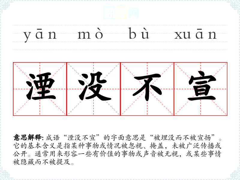成语“湮没不宣”的字面意思是“被埋没而不被宣扬”。它的基本含义是指某种事物或情况被忽视、掩盖,未被广泛传播或公开。通常用来形容一些有价值的事物或声音被无视,或某些事情被隐藏而不被提及。