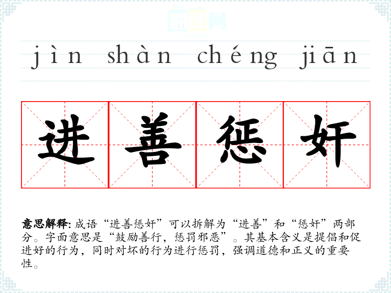 成语“进善惩奸”可以拆解为“进善”和“惩奸”两部分。字面意思是“鼓励善行,惩罚邪恶”。其基本含义是提倡和促进好的行为,同时对坏的行为进行惩罚,强调道德和正义的重要性。