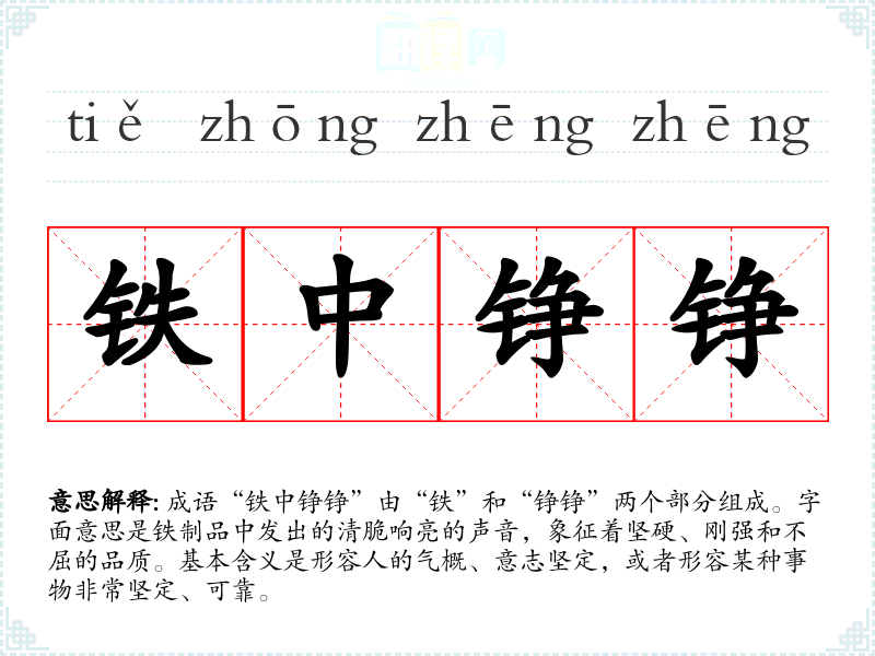 成语“铁中铮铮”由“铁”和“铮铮”两个部分组成。字面意思是铁制品中发出的清脆响亮的声音,象征着坚硬、刚强和不屈的品质。基本含义是形容人的气概、意志坚定,或者形容某种事物非常坚定、可靠。