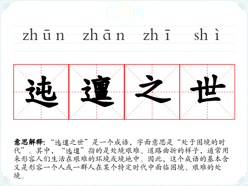 “迍邅之世”是一个成语,字面意思是“处于困境的时代”。其中,“迍邅”指的是处境艰难、道路曲折的样子,通常用来形容人们生活在艰难的环境或境地中。因此,这个成语的基本含义是形容一个人或一群人在某个特定时代中面临困境、艰难的处境。