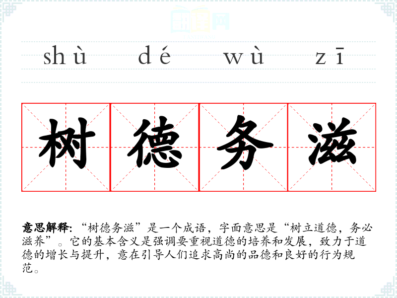 “树德务滋”是一个成语,字面意思是“树立道德,务必滋养”。它的基本含义是强调要重视道德的培养和发展,致力于道德的增长与提升,意在引导人们追求高尚的品德和良好的行为规范。