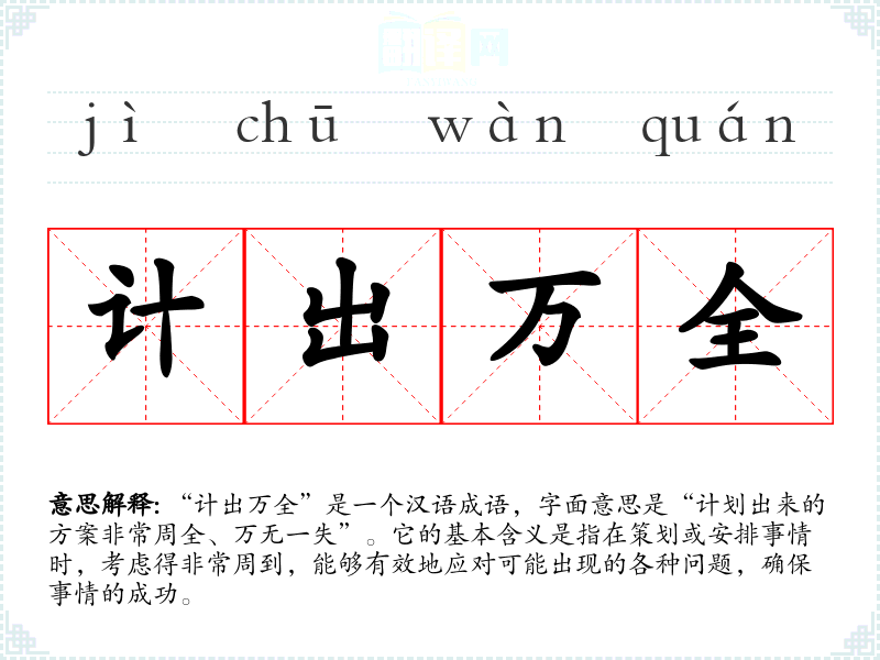 “计出万全”是一个汉语成语,字面意思是“计划出来的方案非常周全、万无一失”。它的基本含义是指在策划或安排事情时,考虑得非常周到,能够有效地应对可能出现的各种问题,确保事情的成功。