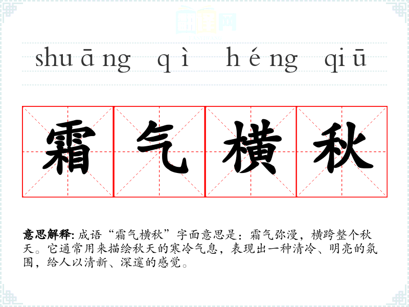成语“霜气横秋”字面意思是:霜气弥漫,横跨整个秋天。它通常用来描绘秋天的寒冷气息,表现出一种清冷、明亮的氛围,给人以清新、深邃的感觉。