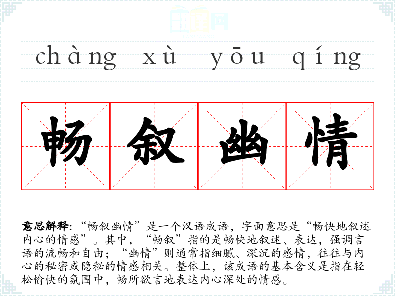 “畅叙幽情”并没有一个明确的历史典故或文学出处,但其构成的字词在古代文学中有较为广泛的使用。常用于描绘人与人之间亲密、深入的情感交流,尤其是在文人雅士之间的交往中。这种情感交流在古代诗词、散文中屡见不鲜,反映了人们对于情感表达的重视。
