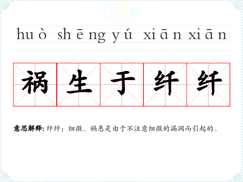 | 祸生于纤纤 | 纤纤:细微。祸患是由于不注意细微的漏洞而引起的。 |