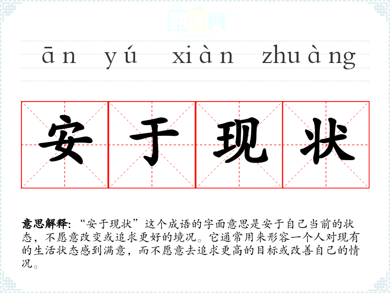 “安于现状”这个成语的字面意思是安于自己当前的状态,不愿意改变或追求更好的境况。它通常用来形容一个人对现有的生活状态感到满意,而不愿意去追求更高的目标或改善自己的情况。