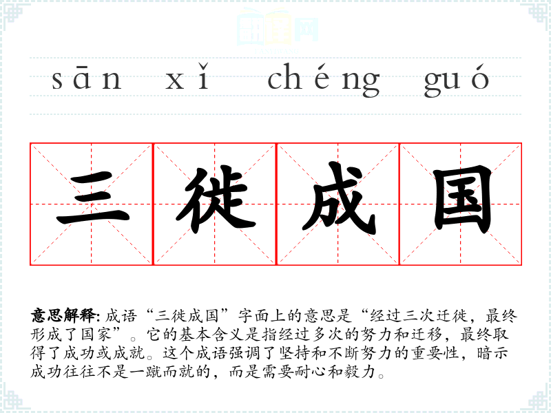 成语“三徙成国”字面上的意思是“经过三次迁徙,最终形成了国家”。它的基本含义是指经过多次的努力和迁移,最终取得了成功或成就。这个成语强调了坚持和不断努力的重要性,暗示成功往往不是一蹴而就的,而是需要耐心和毅力。