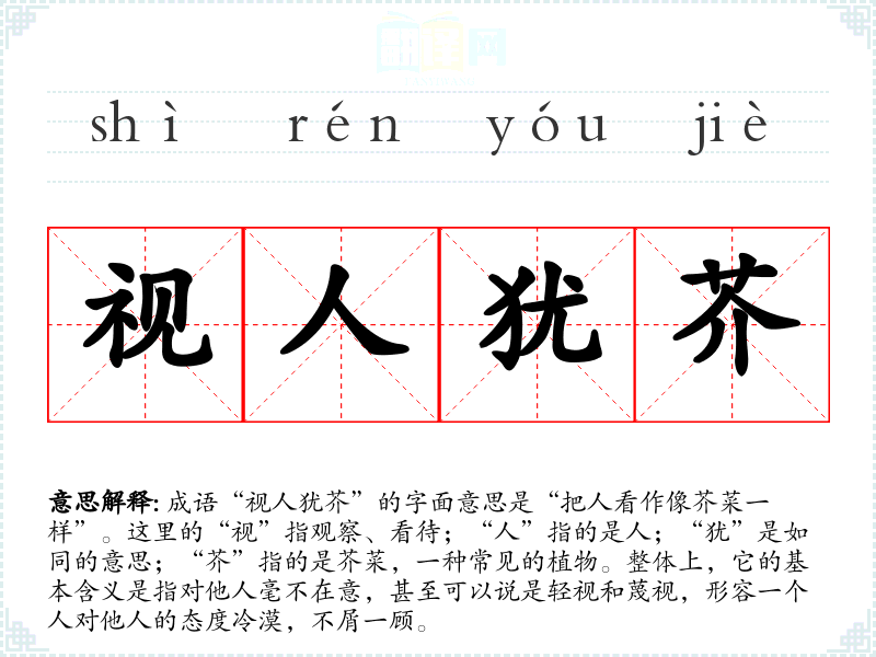 成语“视人犹芥”的字面意思是“把人看作像芥菜一样”。这里的“视”指观察、看待;“人”指的是人;“犹”是如同的意思;“芥”指的是芥菜,一种常见的植物。整体上,它的基本含义是指对他人毫不在意,甚至可以说是轻视和蔑视,形容一个人对他人的态度冷漠,不屑一顾。