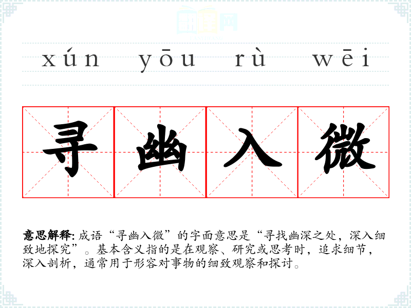 成语“寻幽入微”的字面意思是“寻找幽深之处,深入细致地探究”。基本含义指的是在观察、研究或思考时,追求细节,深入剖析,通常用于形容对事物的细致观察和探讨。