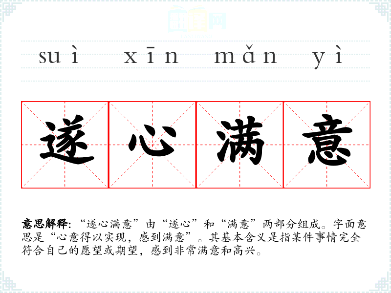 “遂心满意”由“遂心”和“满意”两部分组成。字面意思是“心意得以实现,感到满意”。其基本含义是指某件事情完全符合自己的愿望或期望,感到非常满意和高兴。