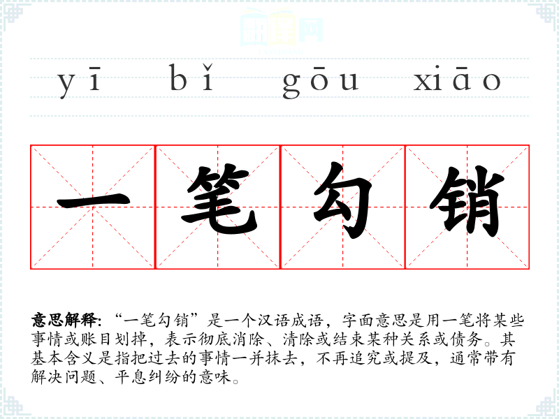 “一笔勾销”是一个汉语成语,字面意思是用一笔将某些事情或账目划掉,表示彻底消除、清除或结束某种关系或债务。其基本含义是指把过去的事情一并抹去,不再追究或提及,通常带有解决问题、平息纠纷的意味。