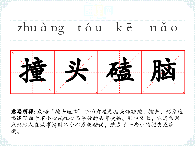 成语“撞头磕脑”字面意思是指头部碰撞、撞击,形象地描述了由于不小心或粗心而导致的头部受伤。引申义上,它通常用来形容人在做事情时不小心或犯错误,造成了一些小的损失或麻烦。