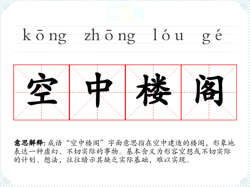 成语“空中楼阁”字面意思指在空中建造的楼阁,形象地表达一种虚幻、不切实际的事物。基本含义为形容空想或不切实际的计划、想法,往往暗示其缺乏实际基础,难以实现。