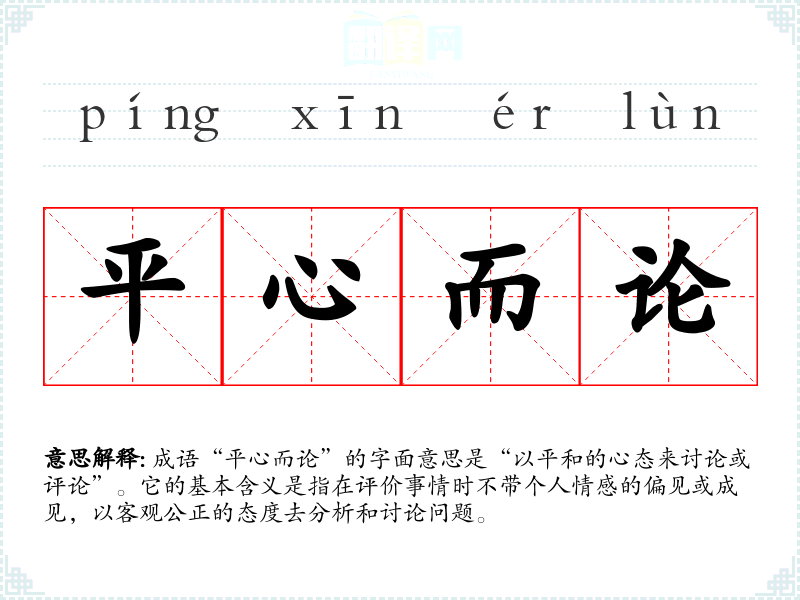 成语“平心而论”的字面意思是“以平和的心态来讨论或评论”。它的基本含义是指在评价事情时不带个人情感的偏见或成见,以客观公正的态度去分析和讨论问题。