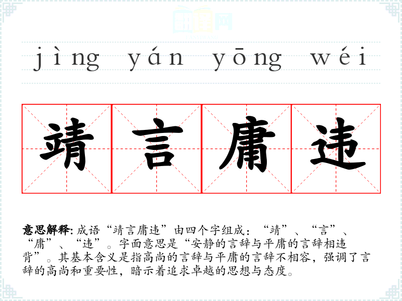 成语“靖言庸违”由四个字组成:“靖”、“言”、“庸”、“违”。字面意思是“安静的言辞与平庸的言辞相违背”。其基本含义是指高尚的言辞与平庸的言辞不相容,强调了言辞的高尚和重要性,暗示着追求卓越的思想与态度。