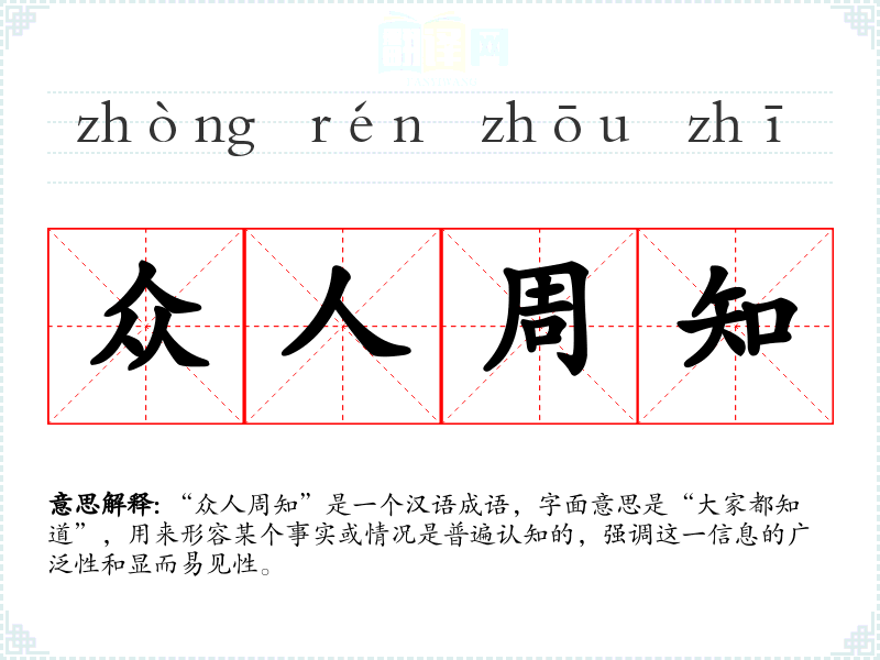 “众人周知”是一个汉语成语,字面意思是“大家都知道”,用来形容某个事实或情况是普遍认知的,强调这一信息的广泛性和显而易见性。