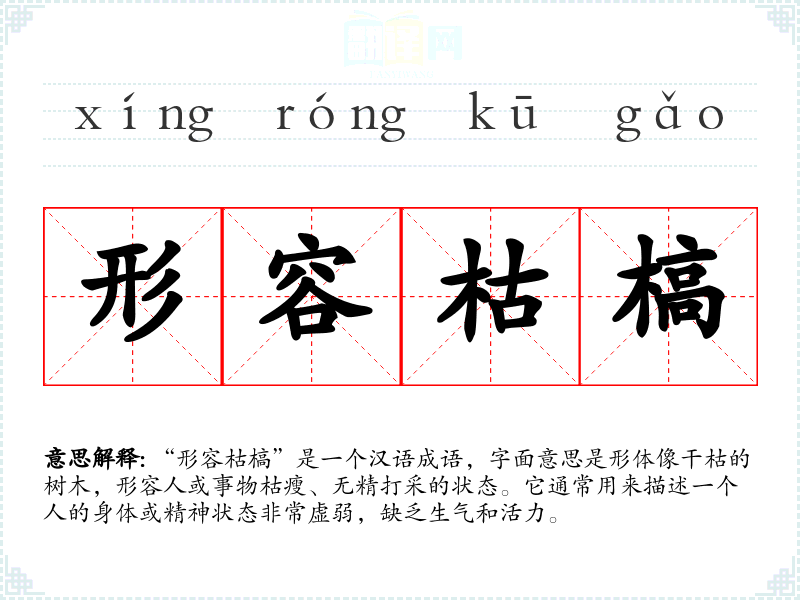 | 形容枯槁 | 槁:枯干。指形体容貌消瘦不堪。 |