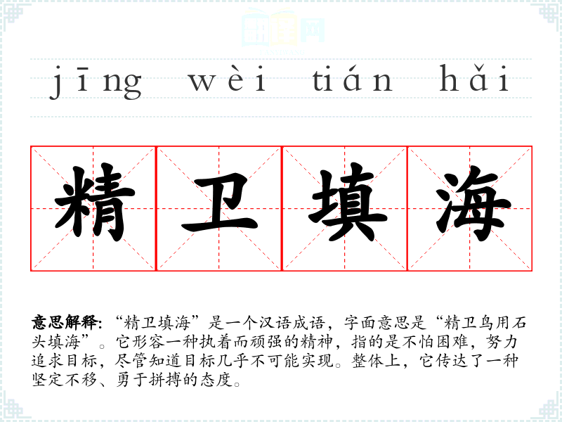 “精卫填海”是一个汉语成语,字面意思是“精卫鸟用石头填海”。它形容一种执着而顽强的精神,指的是不怕困难,努力追求目标,尽管知道目标几乎不可能实现。整体上,它传达了一种坚定不移、勇于拼搏的态度。