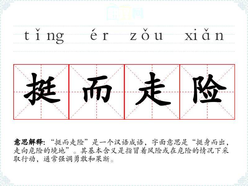 “挺而走险”是一个汉语成语,字面意思是“挺身而出,走向危险的境地”。其基本含义是指冒着风险或在危险的情况下采取行动,通常强调勇敢和果断。