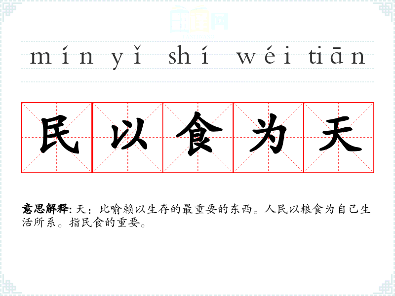| 民以食为天 | 天:比喻赖以生存的最重要的东西。人民以粮食为自己生活所系。指民食的重要。 |