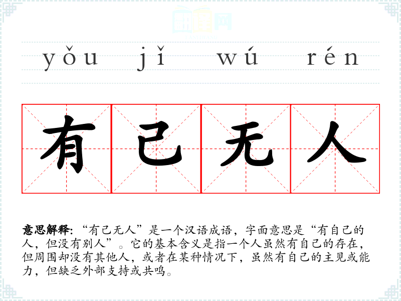 “有己无人”是一个汉语成语,字面意思是“有自己的人,但没有别人”。它的基本含义是指一个人虽然有自己的存在,但周围却没有其他人,或者在某种情况下,虽然有自己的主见或能力,但缺乏外部支持或共鸣。