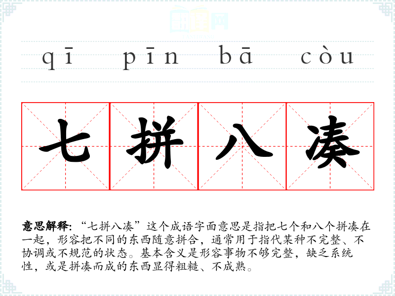 “七拼八凑”这个成语字面意思是指把七个和八个拼凑在一起,形容把不同的东西随意拼合,通常用于指代某种不完整、不协调或不规范的状态。基本含义是形容事物不够完整,缺乏系统性,或是拼凑而成的东西显得粗糙、不成熟。