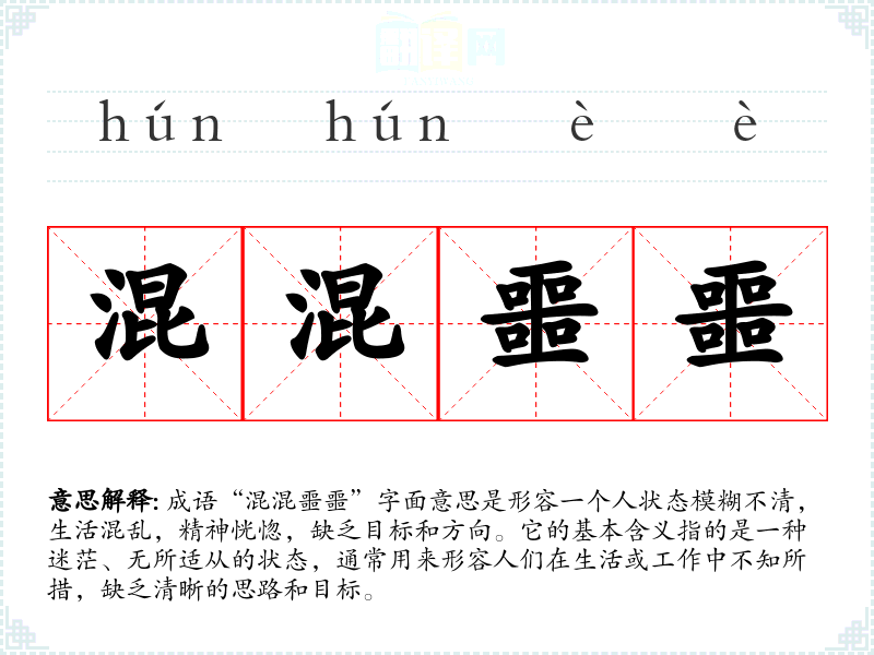成语“混混噩噩”字面意思是形容一个人状态模糊不清,生活混乱,精神恍惚,缺乏目标和方向。它的基本含义指的是一种迷茫、无所适从的状态,通常用来形容人们在生活或工作中不知所措,缺乏清晰的思路和目标。