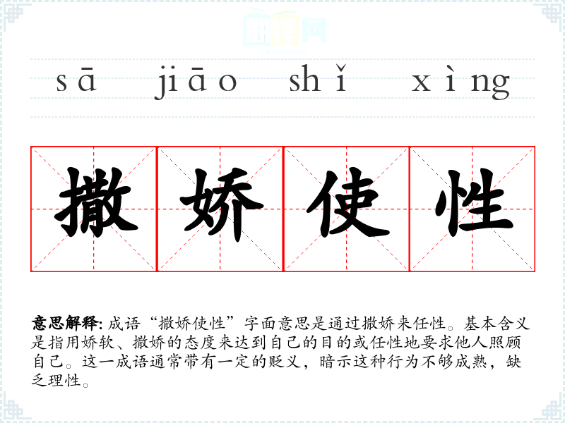 成语“撒娇使性”字面意思是通过撒娇来任性。基本含义是指用娇软、撒娇的态度来达到自己的目的或任性地要求他人照顾自己。这一成语通常带有一定的贬义,暗示这种行为不够成熟,缺乏理性。