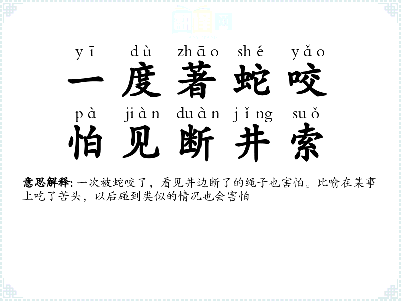 一次被蛇咬了,看见井边断了的绳子也害怕。比喻在某事上吃了苦头,以后碰到类似的情况也会害怕 |