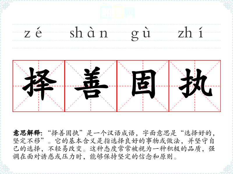 “择善固执”是一个汉语成语,字面意思是“选择好的,坚定不移”。它的基本含义是指选择良好的事物或做法,并坚守自己的选择,不轻易改变。这种态度常常被视为一种积极的品质,强调在面对诱惑或压力时,能够保持坚定的信念和原则。
