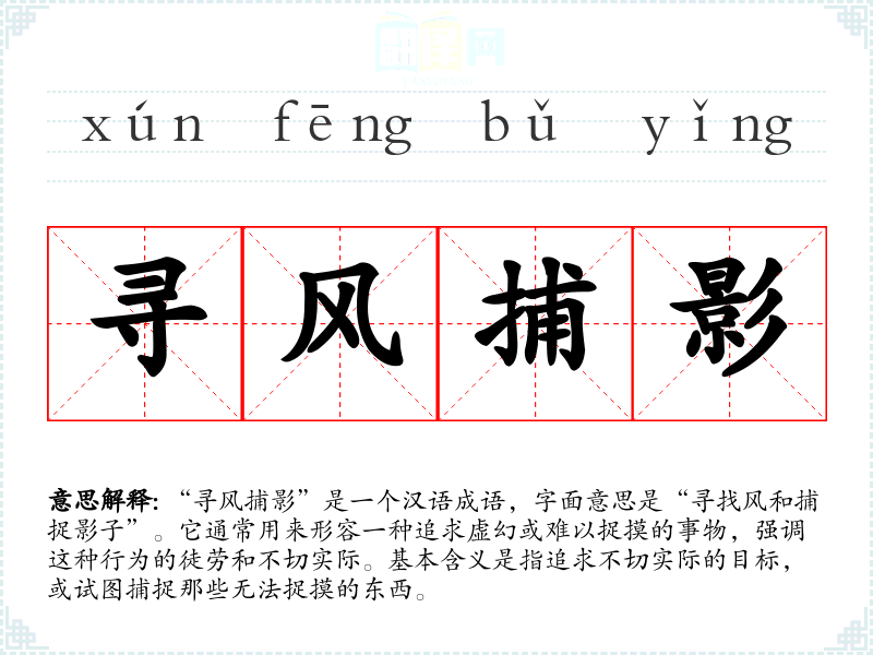 “寻风捕影”是一个汉语成语,字面意思是“寻找风和捕捉影子”。它通常用来形容一种追求虚幻或难以捉摸的事物,强调这种行为的徒劳和不切实际。基本含义是指追求不切实际的目标,或试图捕捉那些无法捉摸的东西。