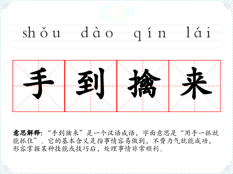 “手到擒来”是一个汉语成语,字面意思是“用手一抓就能抓住”。它的基本含义是指事情容易做到,不费力气就能成功,形容掌握某种技能或技巧后,处理事情非常顺利。